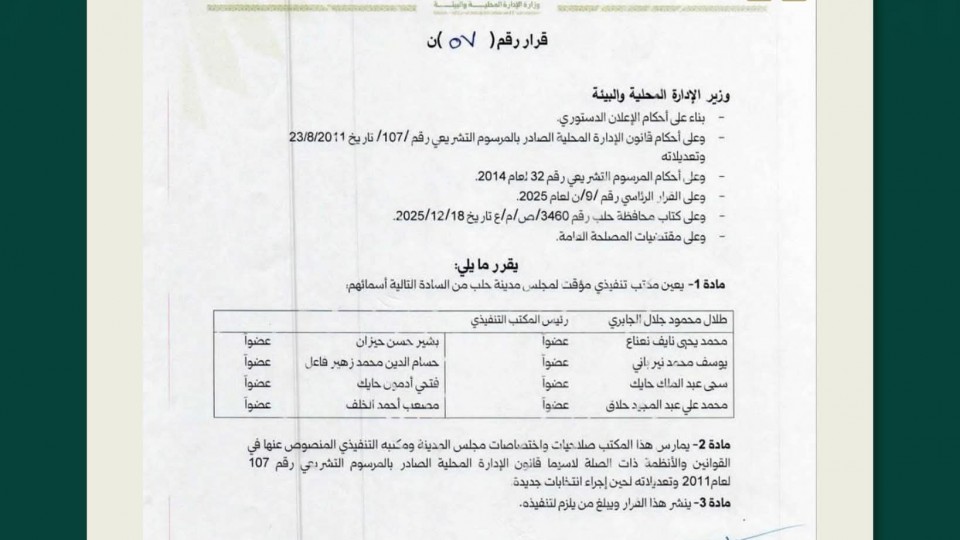 "وزير الإدارة المحلية والبيئة يصدر قراراً بتشكيل المكتب التنفيذي الجديد لمجلس مدينة حلب"...