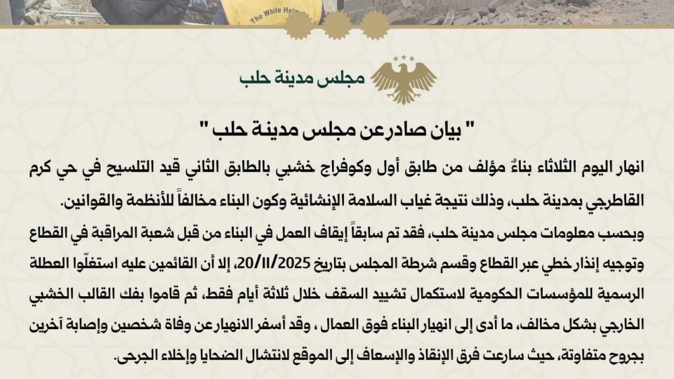 تفاصيل حادثة انهيار مبنى في حي كرم القاطرجي في مدينة حلب