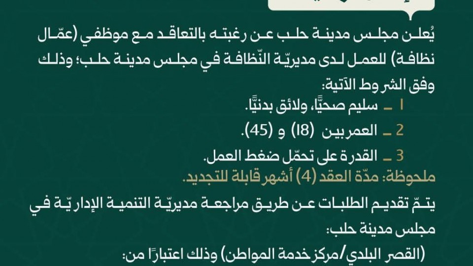 يُعلن مجلس مدينة حلب عن رغبته بالتعاقد مع موظفي (عمّال نظافة)؛ وذلك وفق الشروط المرفقة في الصورة. #مجلس_مدينة_حلب https://www.facebook.com/share/p/1Bu6Na5td6/